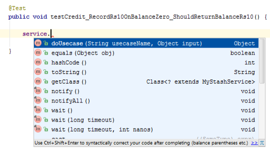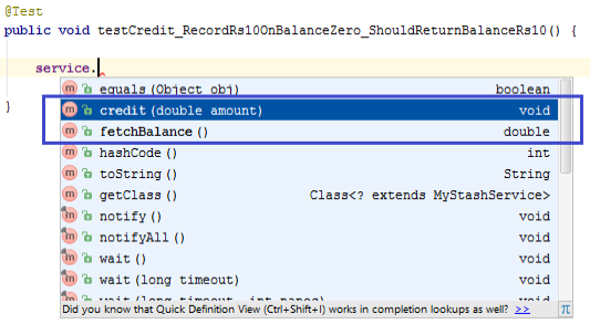 What does it feel like, to type that “dot” and right there, in your face you see the “credit” method which takes an amount and right below it, the “fetchBalance” method, which would allow you to get your job done. So: